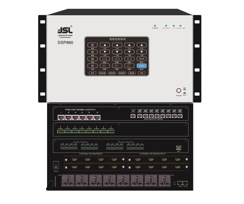 | 支持ioses、androids系统(平板自购) | 内置8进8出音频矩阵处理器 | 内置8进8出视频矩阵切换 | |